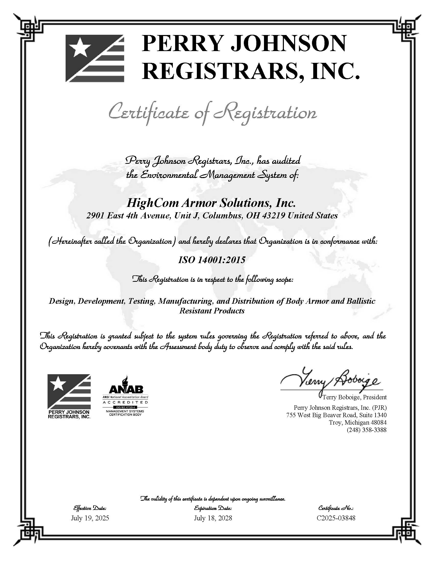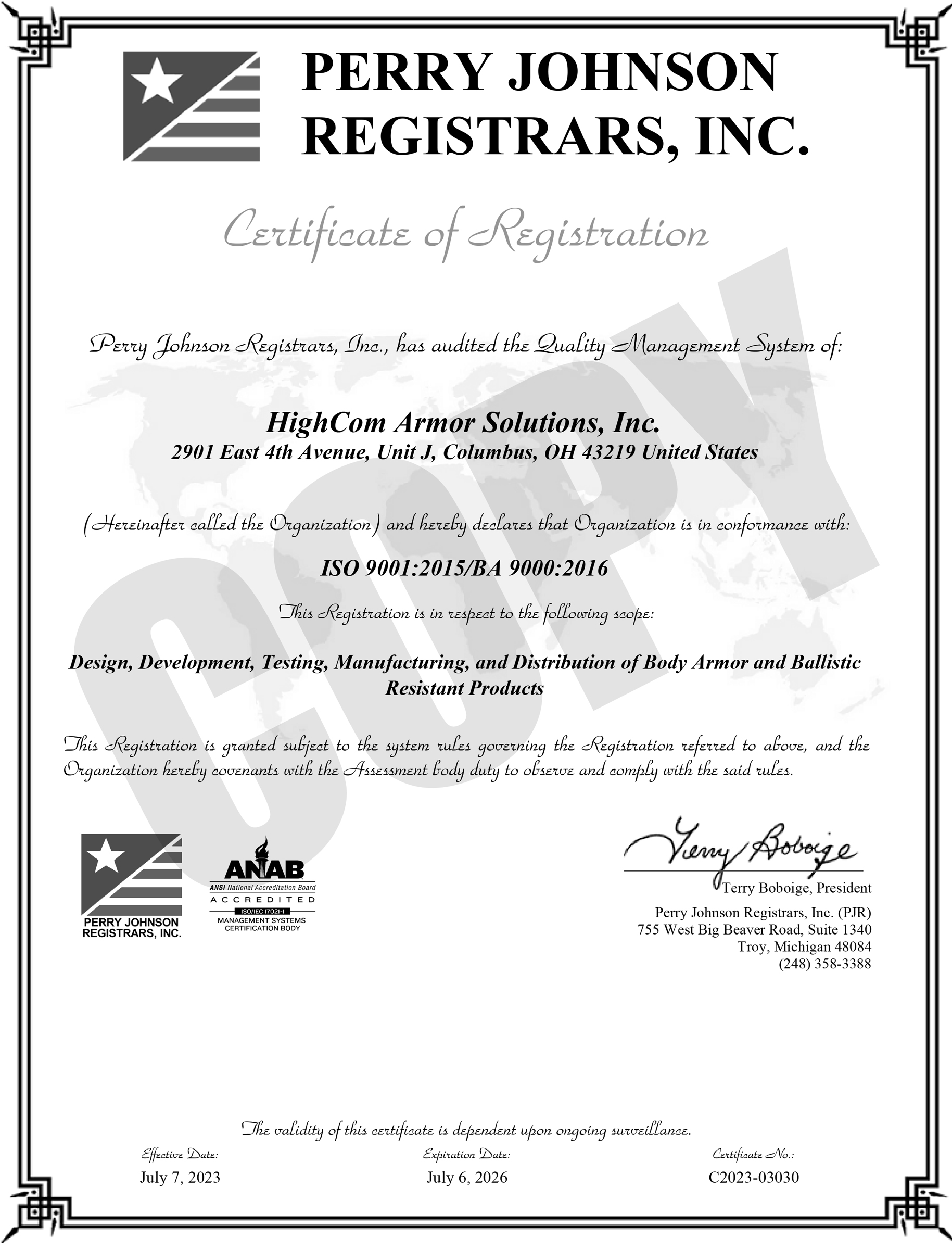 • Our ballistic armor goods are certified by Perry Johnson Registrars (PJR) to ISO 9001:2015 and BA 9000/2016 standards