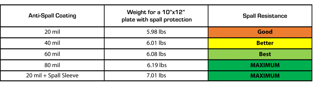 Our 40 mil strike face coating offers BETTER anti-spalling protection while maintaining robust weather and chemical resistance, adding nominal weight, and adding better absorption.